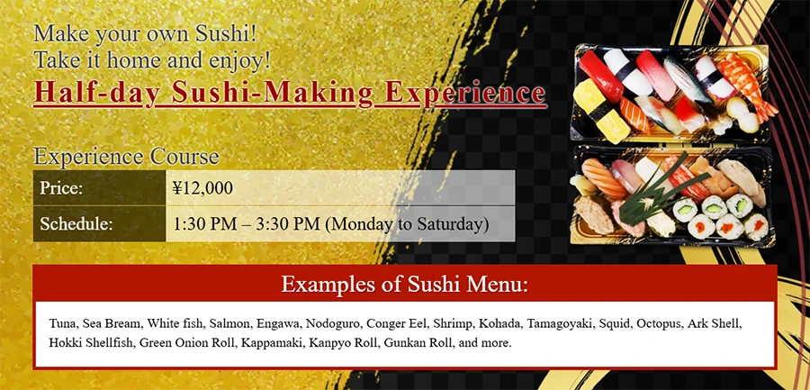 You'll learn to make a wide variety of sushi, including tuna, sea bream, yellowtail, salmon, flounder fin, blackthroat seaperch, conger eel, shrimp, sweet shrimp, gizzard shad, egg omelet, squid, octopus, ark shell, surf clam, as well as negitoro rolls, cucumber rolls, kampyo rolls, and three types of gunkan sushi.